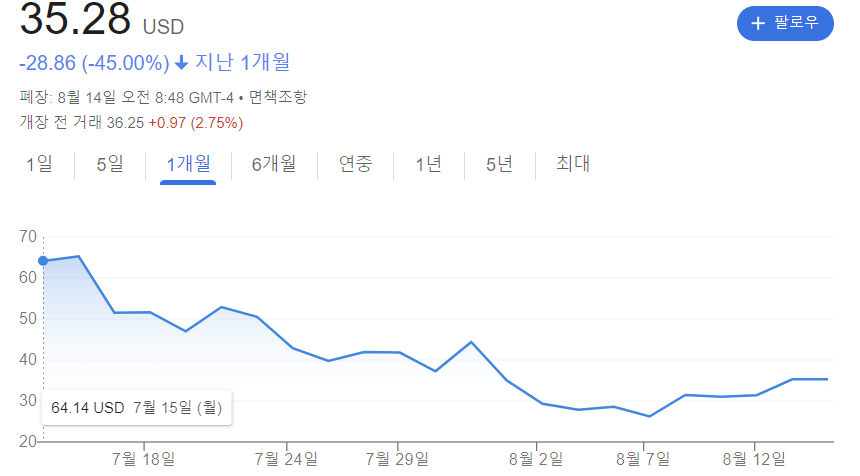 아래의 사진은 SOXL의 한 달간 주가 변동 그래프입니다. 이처럼 경기가 악화되면 주가가 한순간에 크게 하락할 수 있다는 점을 반드시 인지해주세요.